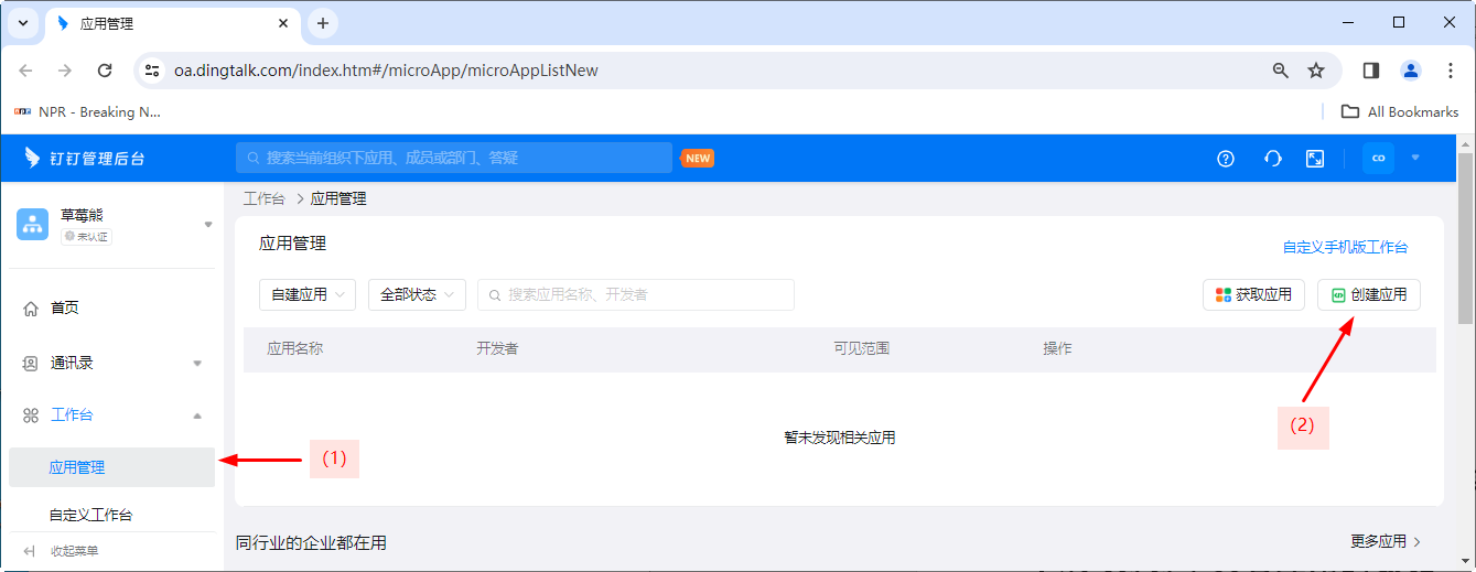1. 登录到钉钉管理后台,在左侧菜单栏选择【工作台】-【应用管理】,然后点击右上角的【创建应用】,进入钉钉开放平台