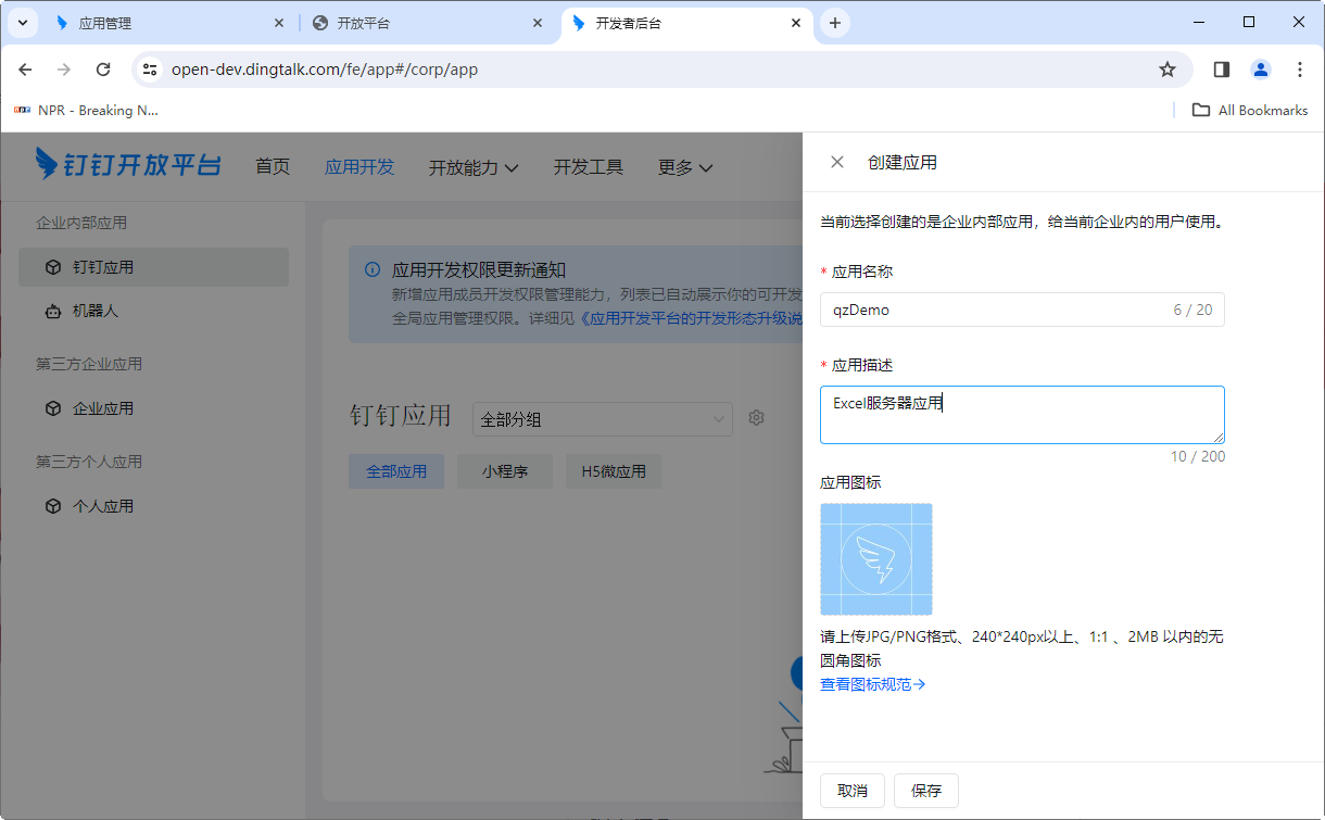 5. 输入应用名称、应用描述,选择一个图标,点击【保存】,应用创建成功