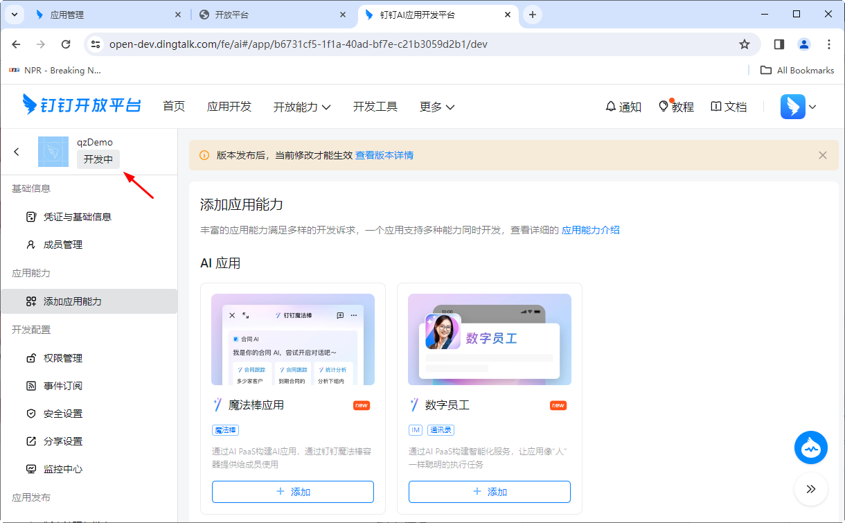 应用创建成功,进入此应用的配置页面,注意看页面的左上角已经显示了刚刚创建好的应用的名称