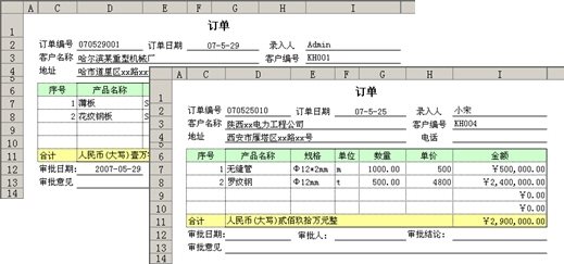 简单地说,模板就是一个空白的表样。依照模板填充了具体的数据之后的表格,称为“表单”。例如,下面的图是一个“订单”模板以及依照订单模板填报的若干表单。