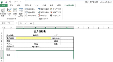 Excel服务器的模板,实际上是一个特殊的Excel工作簿,模板的设计以及表单的填报,是在Excel的环境中进行,从客户端主窗口打开一个模板、或者填报一个表单,都会进入Excel的操作环境,其中增加了“Excel服务器”功能区,针对当前打开的模板或填报的表单所能进行的操作,都列示为此功能区中的按钮。例如,下面的图示,是Excel的操作环境,一个模板被打开,窗口的标题栏显示它正处于设计状态;此时对该模板能够进行的操作,都列示在“Excel服务器”功能区中。