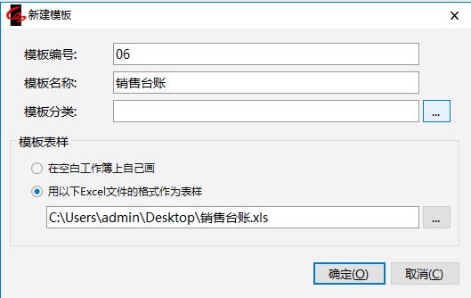 输入模板的编号、名称,注意要选中“用以下Excel文件的格式作为表样”,点击旁边的【…】按钮,选择“销售台帐.xls”,点击【确定】。