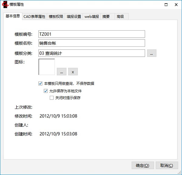 点击工具栏按钮“模板属性”,弹出如下对话框,在“基本信息”选项卡下,选择“本模板只用做查询,不保存数据”。