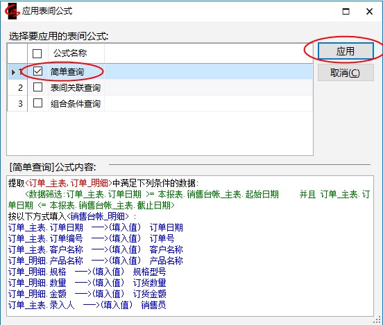 3.弹出应用公式对话框,选中“简单查询”左侧的复选框,按【应用】,如图: