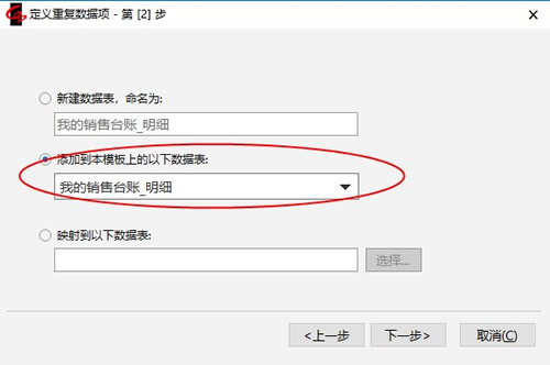 4.在下一步出现的窗口中,选择“添加到本模板上的以下数据表”,表名选择“销售台帐_明细”,点击【下一步】