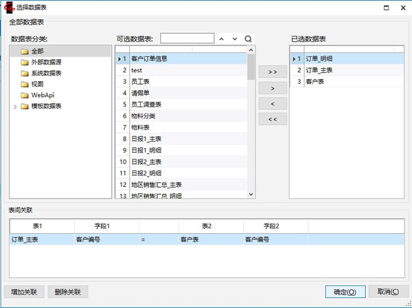 - 选择三个数据表“订单_主表”、“订单_明细”和“客户登记表”,在窗口下半部分的表格中选择输入表间关联条件