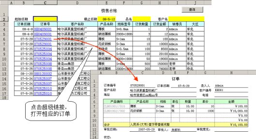 我们在“销售台帐”模板上,通过定义表间公式,可以查询出符合条件的订单列表,但是如果要了解每份订单的完整信息,还需要到我的工作台中具体找到这张订单,打开它,才能看到。下面我们学习一种在查询模板上,方便地查看具体订单的方法:我们在销售台帐上的每个订单号下面加一个超级链接,点击这个链接,直接就可以打开这份订单。如图: