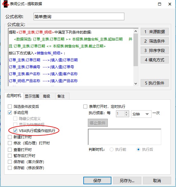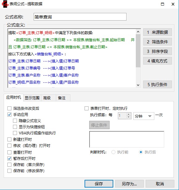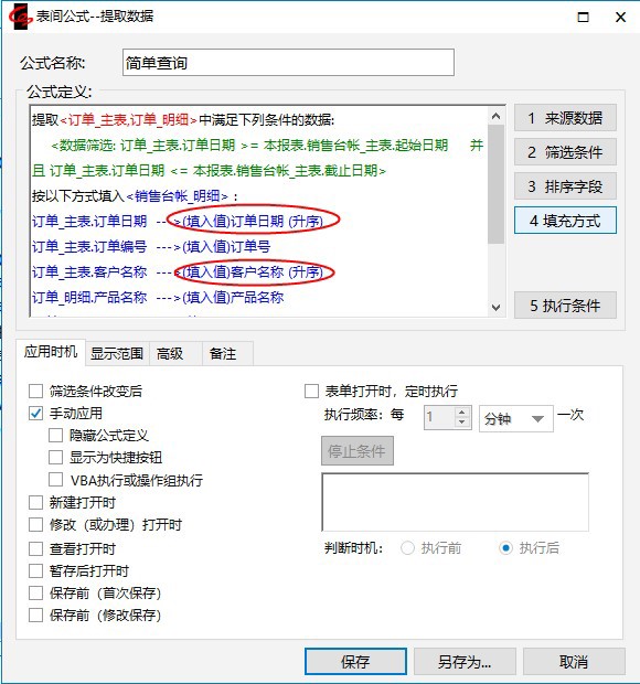 注意:它们和我们以前定义的表间公式相比有了两点不同:1)来源数据是两个表;2)填充方式中有的字段从订单_主表中取值,有的从订单_明细中取值。