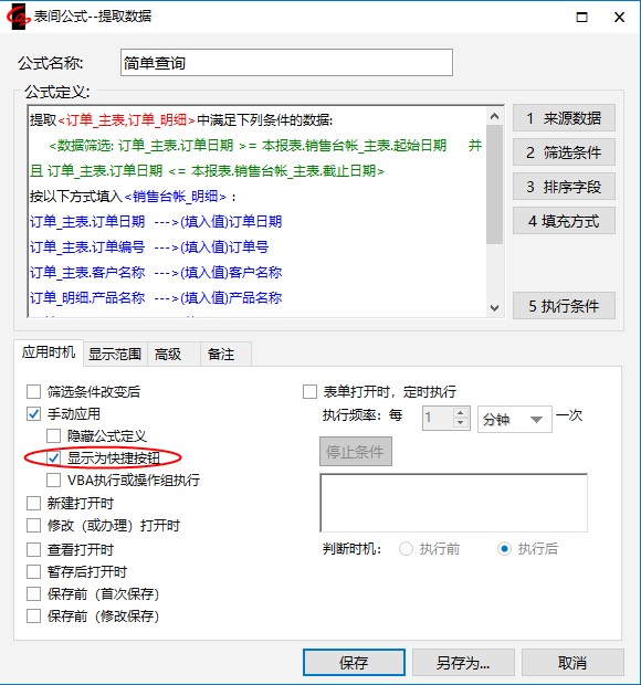 若希望快捷执行手动应用公式,则需要在表间公式的【应用时机】-【手动应用】下勾选【显示为快捷按钮】。