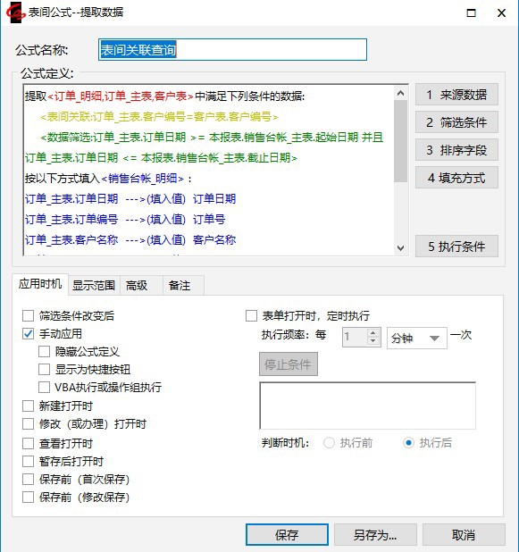 2.把已经定义的表间公式“表间关联查询”另存为一条新公式“组合条件查询”。