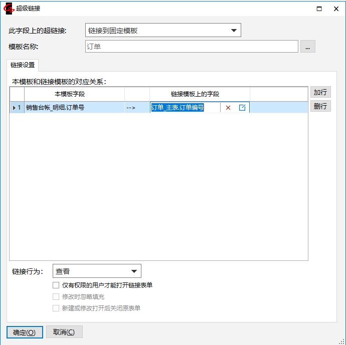 在“链接设置”中,“本模板字段”自动显示了“订单号”,不变,“链接模板上的字段”,在弹出窗口选择“订单_主表.订单编号”;