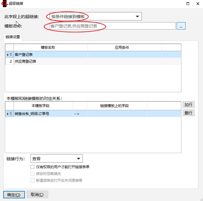 注意:当下拉选择“按条件链接到模板”且只选择了一个模板名称时,必需输入应用条件,表示链接字段满足条件时才启用超级链接功能。