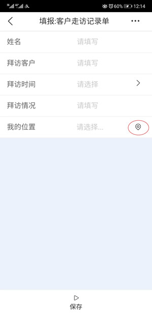 2.当员工用手机填报《客户走访记录单》的时候,点击“我的位置”右侧的定位按钮,如下图: