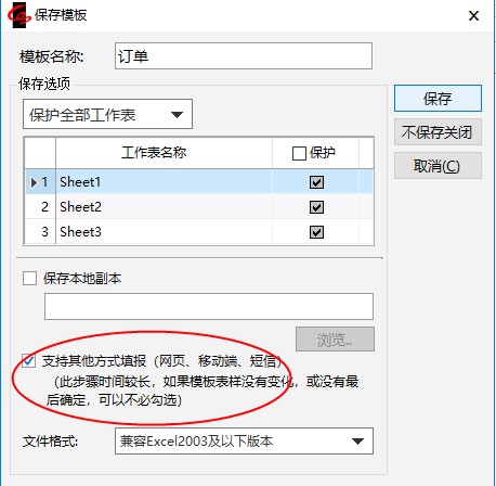其次,在模板保存的时候,要勾选“支持网页填报”并且用户需有模板的"导入数据"权限。
