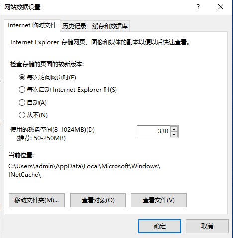 2.在“常规”选项卡上点击【设置…】按钮,弹出对话框,选中“每次访问此页时检查”,按【确定】。回到“Internet选项”对话框