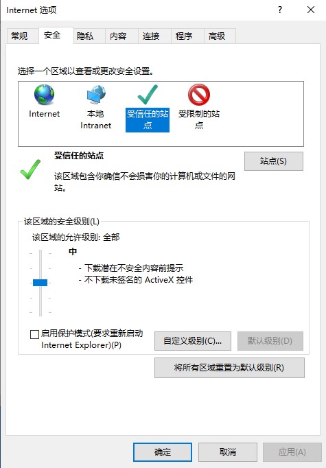3.切换到“安全选项卡”,选中“受信任的站点”,点击【站点…】按钮,如图: