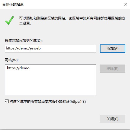 5.在“将该网站添加到区域中”下面的文本框内输入填报网站的网址,按【添加】,网址加入网站列表,如图: