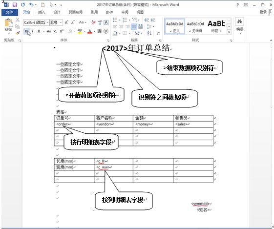 1)数据项识别符:数据项识别符之间的字符将识别成数据项,可使用任意字符(若word表格中数据需要识别为主表字段则必需以“m_”开头。如:订单号:<order_no>为按行明细表字段;<m_order_no>则为主表字段)。