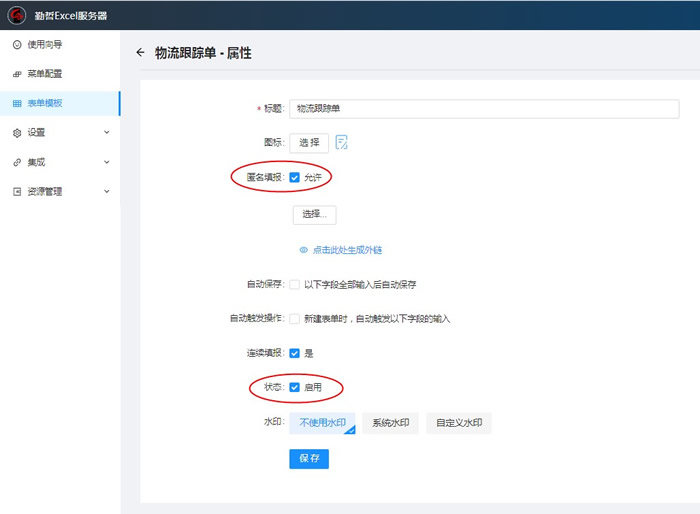 移动端设置模板属性如下:【匿名填报】勾选“允许”,【状态】勾选“启用”。