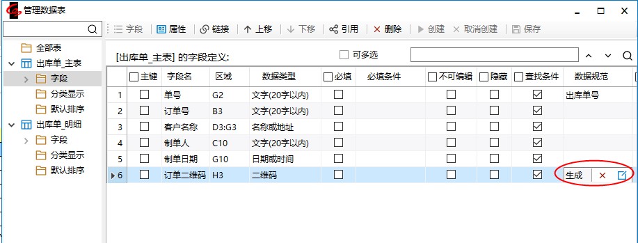 2) 打开“出库单”数据管理表,选择“订单二维码”字段,点击【数据规范】浏览按钮。