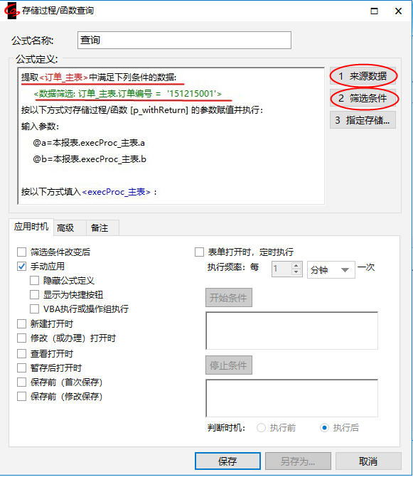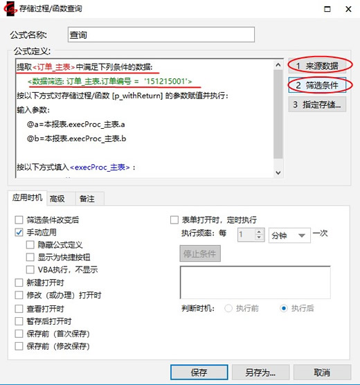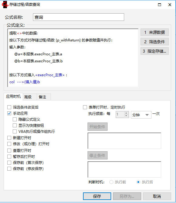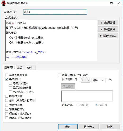 4.点击【继续】返回“存储过程/函数查询”表间公式窗口。输入公式名称,选择应用时机,点击【保存】,完成表间公式新建。