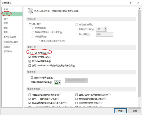 注意:按下图所示,选择excel菜单【文件】-【选项】,在excel选项窗口中选中【公式】并勾选【R1C1引用样式】确定来设置excel的公式格式。