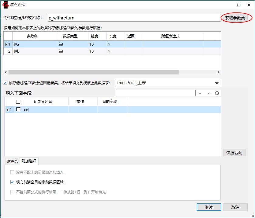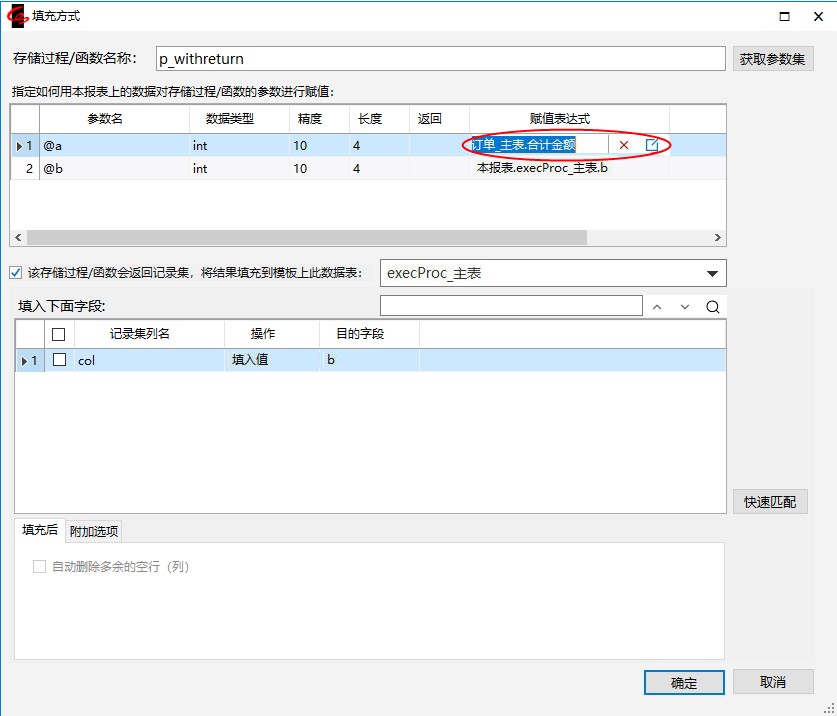 3.将本报表输入的a、b值分别赋值给存储过程中a、b参数,存储过程返回集结果“col”填入表单中字段b。