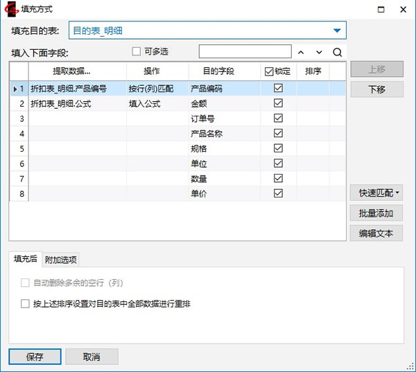 5) 点击【填充方式】按钮后按下图所示进行设置并保存。(注意:当操作需要选择【填充公式】时,需先将操作方式选为“填入公式”,再去设置表达式。)
