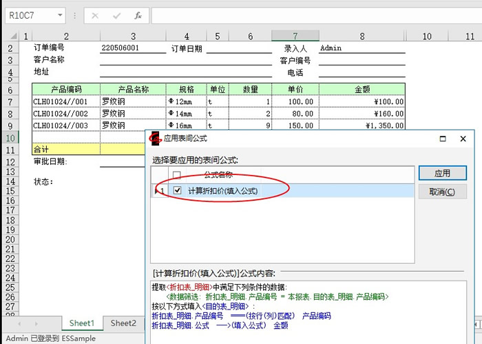 例如:当有促销活动时,下订单时我们选择产品,不同产品会有不同的折扣。在生成订单时通过【填入公式】功能,则可依选择的商品提取对应不同的excel公式来计算商品的金额。