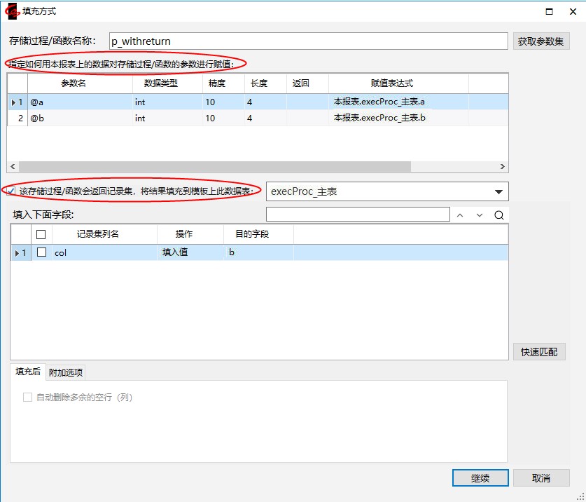 通过表间公式执行存储过程/函数,存储过程/函数返回记录集结果可填充到模板的数据表中。