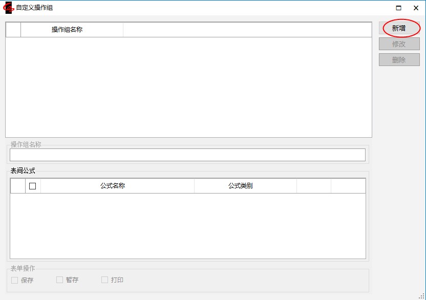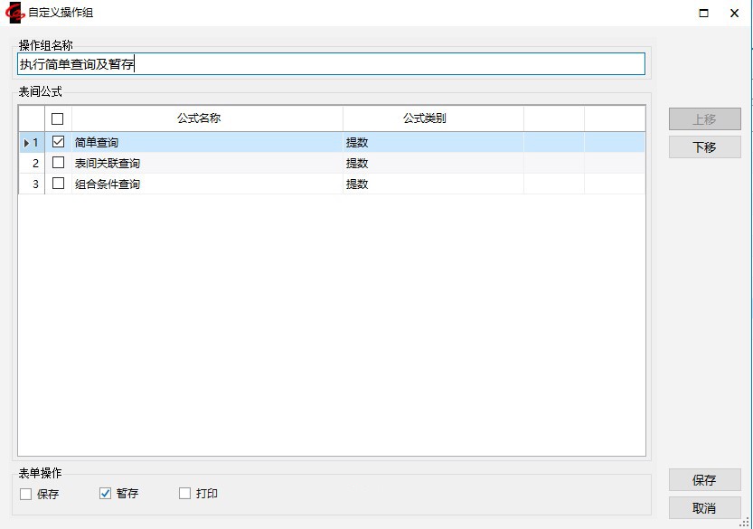 操作组可理解为若干个表间公式及表单操作(保存、暂存、打印)组合在一起,执行时组中表间公式依次执行。