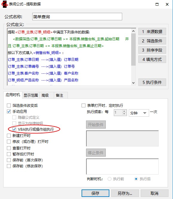 当手动执行的表间公式可在操作组执行时,不希望重复在手工执行窗口,则可在“手动应用”下勾选“VBA执行或操作组执行”选项。