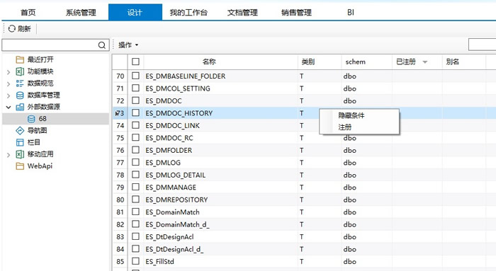 2.在右侧勾选要注册的表或视图(可多选、全选),选择右键弹出菜单【注册】,弹出“批量注册数据表”窗口。
