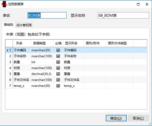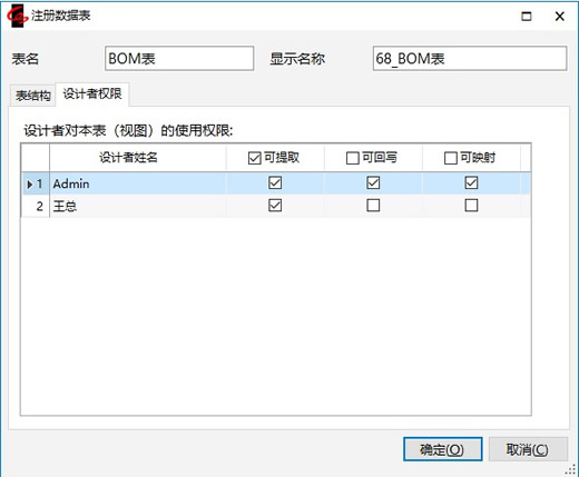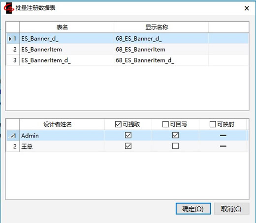 3.窗口中列出所有选中的表/视图的表名及显示名称。并列出所有拥有设计者权限的用户名,选择哪个设计者对表有使用权限,有哪些权限后【确定】,完成数据表的批量注册。