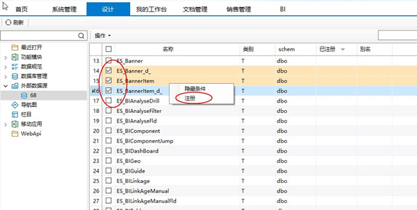 2.在右侧选中(不勾选)要注册的表或视图,选择右键弹出菜单【注册】,弹出“注册数据表”窗口