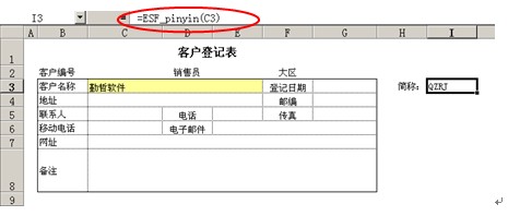 在我们的客户登记表模板中,我们可以在I3单元格增加一个字段“简称”,输入Excel公式:=ESF_pinyin(C3),则把C3处输入的中文名称转换成其每个汉字的拼音首字母。