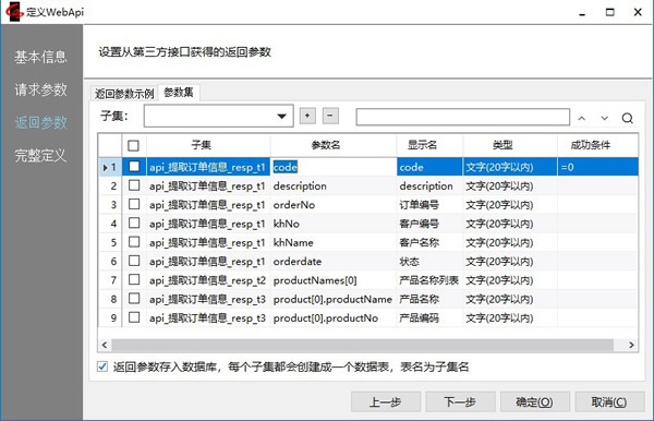 勾选“返回参数存入数据库,每个子集都会创建成一个数据表,表名为子集名”,在成功调用此WebApi后,其返回数据会自动保存到数据库中,可做为数据源使用。