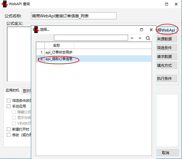 2.输入公式名称后点击【选择WebApi】按钮,选择“api_提取订单信息”,【确定】。