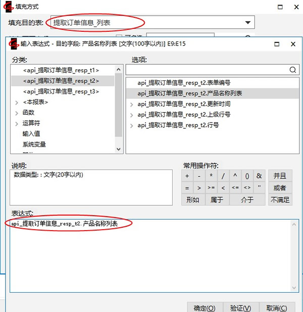5.点击【填充方式】按钮,选择填充目的表为“提取订单信息_列表”,输入如下目的字段表达式,【确定】。