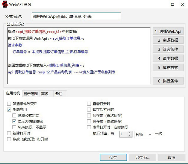 定义了接口之后,还需要指定何时/怎样调用此接口。我们把调用WebApi 当成一种特别的表间公式看待,调用接口就是对表间公式的执行,可以选择各种执行的时机。