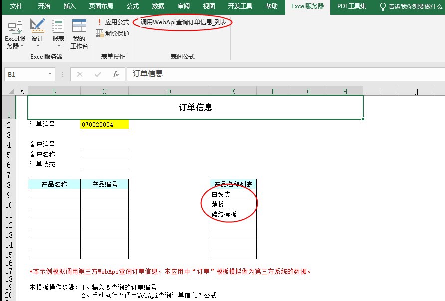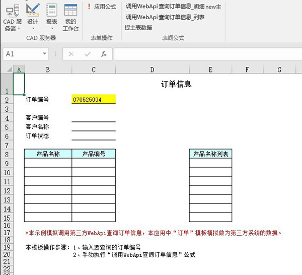 我的工作台中选中“提取订单信息”模板,输入存在的订单编号“070525004”执行“调用WebApi查询订单信息_列表”表间公式。提取正确数据。