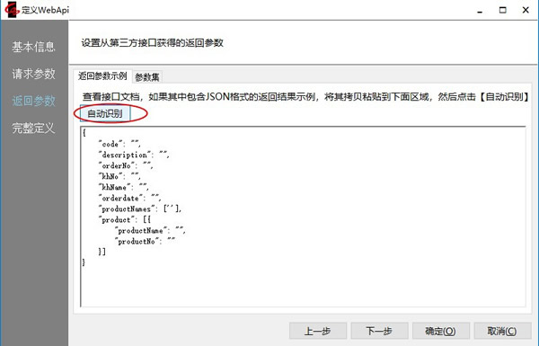 3.点击【下一步】至“返回参数”,输入(或粘贴)JSON格式的返回参数(目前只支持json格式)到“返回参数示例”: