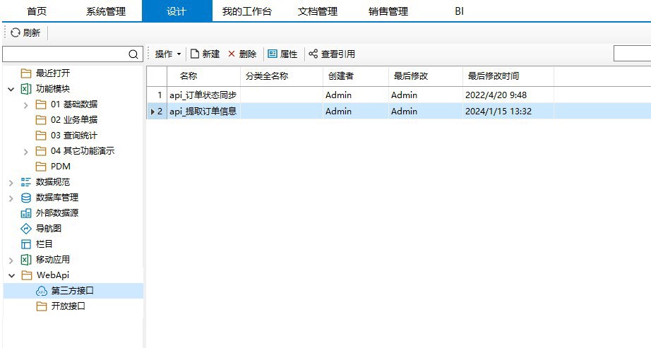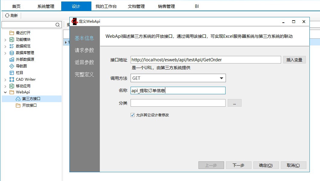 1. 设计栏目下选中【WebApi】-【第三方接口】,点击【新建】,按下图所示输入“基本信息”内容。