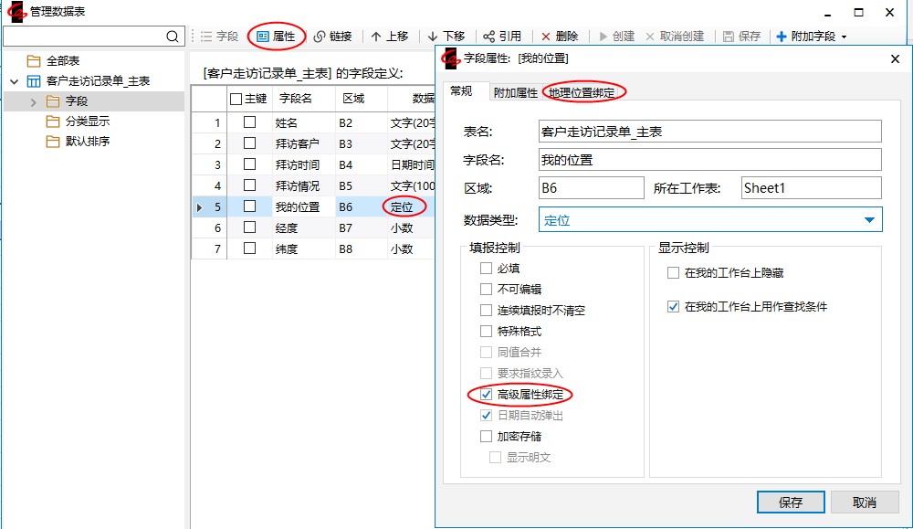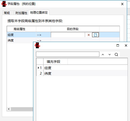 选中“地理位置绑定”选项卡,将经度、纬度绑定在数据表中的数字字段。