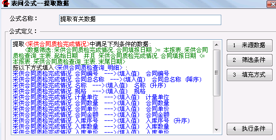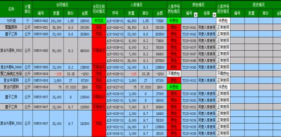 1、采供合同质检表:物料流程:合同—入库—质检—使用(退货),该查询表反映各物料的合同完成情况、质检结果等。