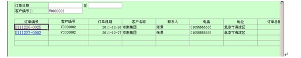 订单查询表为纯查询模板,不保存数据。用户可以使用该模板,依据订单日期和客户编号查询订单记录。在查询结果中点击订单编号链接可以查看该订单的详情。