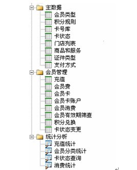 如上图所示,本系统共分为三个部分,分别是主数据、会员管理和统计分析。主数据部分用于存储系统运行所需要的各种基础数据;会员管理部分为日常管理过程中需要使用的模板;统计分析部分用于对会员信息进行统计分析。