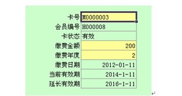当会员卡过期后,会员需要缴纳会员费来延长有效期。缴纳会员费时,需使用如下图所示的模板。录入卡号后,系统将自动提取会员编号、卡状态和该卡片当前有效期。用户需录入缴费金额和延长有效期的年数,然后系统将自动计算延长后的有效期。