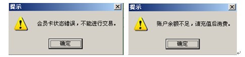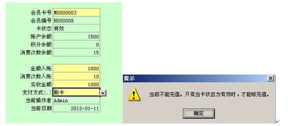 注意:只有当会员卡的状态为“有效”时才能够进行充值,如果为其它状态,系统将提示错误,如下图所示,不能保存。