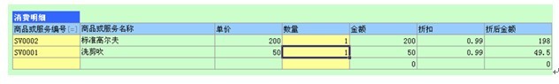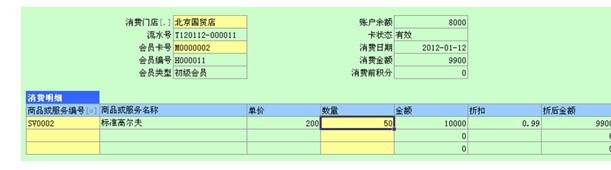 会员消费记录如下图所示,用户选择消费门店并输入会员卡号码后,系统自动提取会员编号、会员类型、账户余额、卡状态、消费前积分信息。然后,用户可以在消费明细表中输入商品或服务编号,系统将自动提取名称、单价,并计算折扣(计算结果已包含折上折)。用户输入数量后,系统自动计算折后金额。